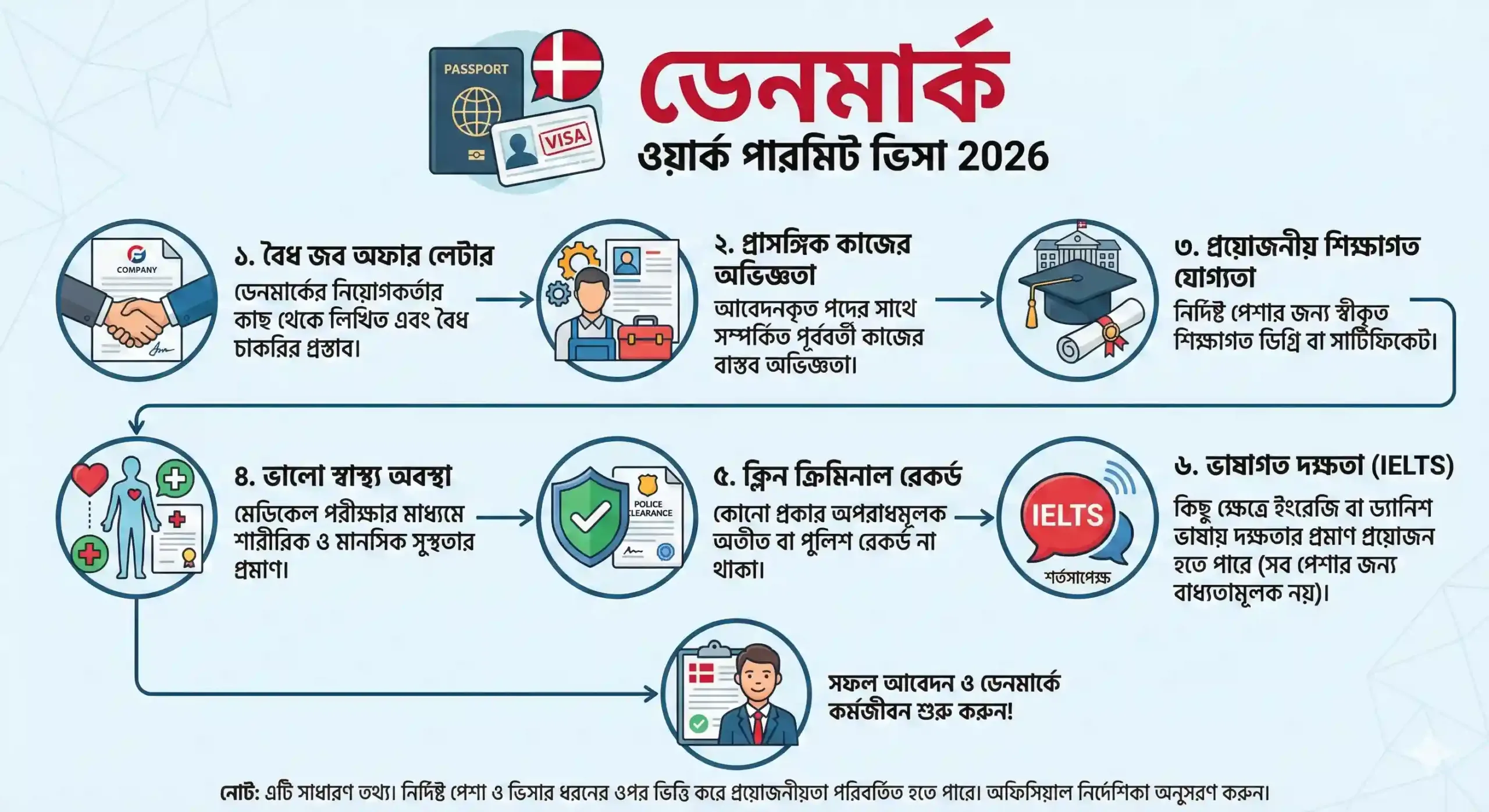 ডেনমার্ক ওয়ার্ক পারমিট ভিসা 2026 পেতে কিছু নির্দিষ্ট যোগ্যতা পূরণ করতে হয়। সাধারণভাবে যেসব বিষয় গুরুত্বপূর্ণ তা হলো: